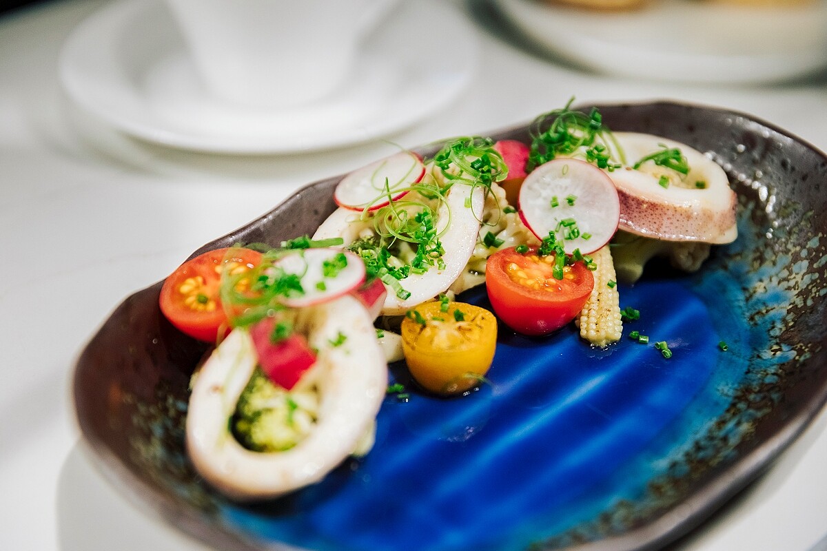 當列車行徑龜山島時可品嚐到以炙燒過的現流Q彈透抽搭襯香烤花椰菜的焦香味,並佐以裹上香甜焦糖的宜蘭金棗、日蔥及櫻桃蘿蔔,最後淋上特調的芥末油醋醬,讓旅客品味濃郁的蘭陽氣息,餐盤特別選用藍色手作陶盤,映襯出山與海的迷人氛圍。