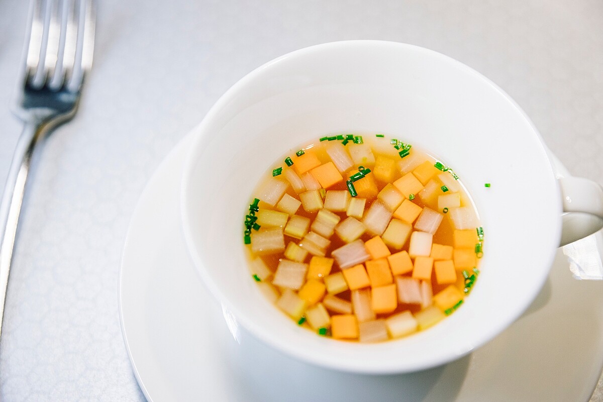 是以櫻桃鴨高湯綴以鮮嫩多汁的煙燻鴨胸及溫泉鄉特產時蔬,為金黃色的清澄湯品堆疊出繁花似錦的春意與多層次的口感。