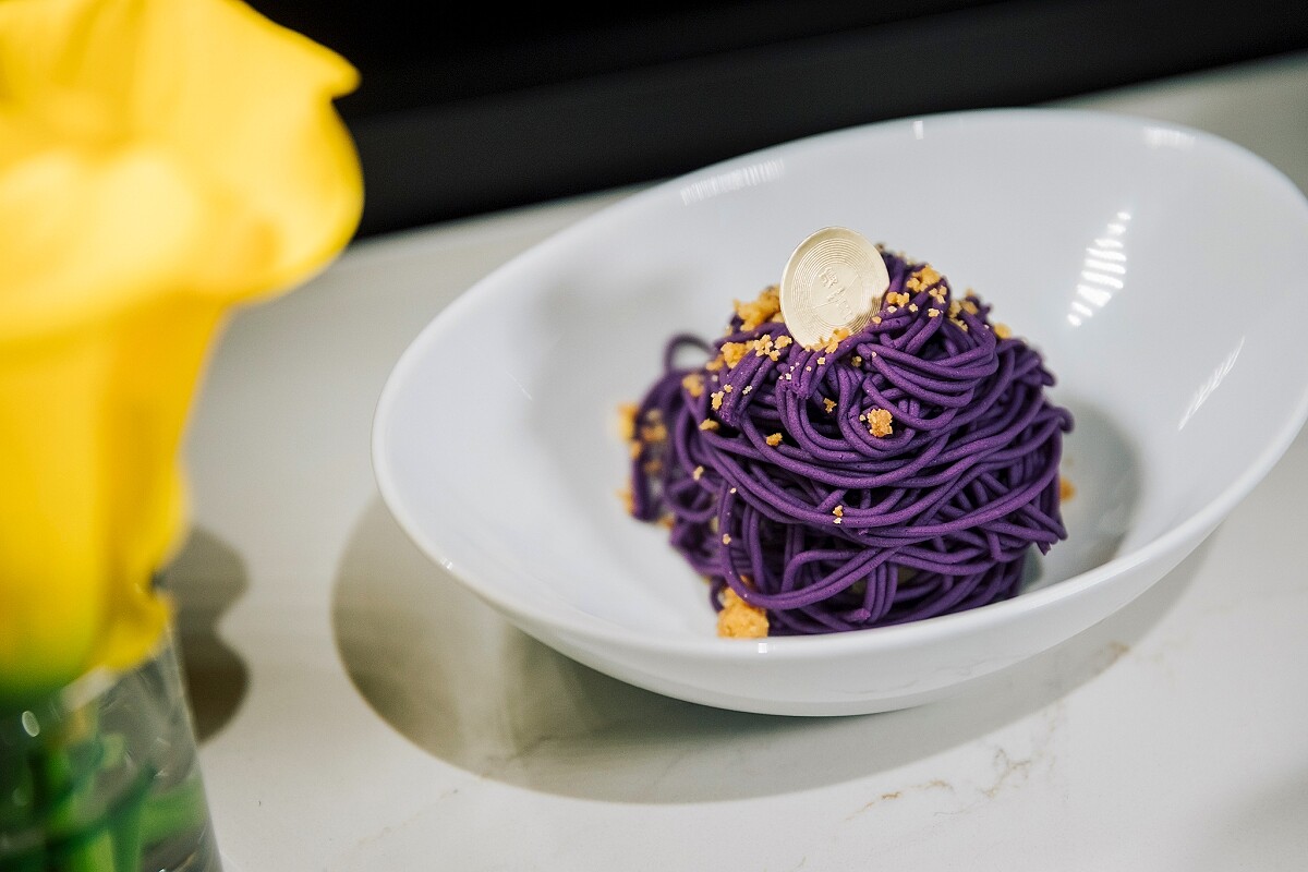 甜點則是改良自晶華酒店最受好評的人氣菜單,以全臺獨一無二的「拉麵擠花機」將花蓮紫心地瓜泥壓製成細如麵條般的形狀,裝飾於生乳捲上,製成猶如法式蒙布朗的花蓮版療癒甜品。