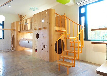 花蓮鄉野假期的晴朗,一如孩子滿懷期待的笑容,伴著吉安田間點點綠意,就要開展美好回憶,彎進離市區不遠,卻保有日常靜謐的小路,一幢淡暖色的家居住宅等候著妳們的到來——俏皮門牌上的「飯盒梵禾」,可愛疊詞如妳們活潑跳躍的姿態,在自然懷抱中體驗頌缽的療癒,跟著親切主人逸文,奔向屋前草坪,轉開家居大門,映入眼簾的不是日常客廳,而是一座令人驚喜的木造巨型遊樂間!
