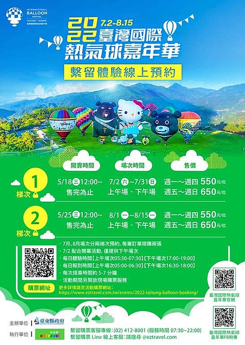 「2022台東熱氣球嘉年華」提供上午場(05:30~07:30)及下午場(17:00~19:00)兩場繫留體驗,每場次僅開放80個名額。現在就能上易遊網預約7月或8月場次。票價分別為週一至週四平日價550元、週五至週日及國定假日為650元。