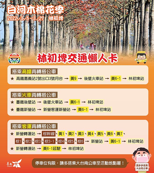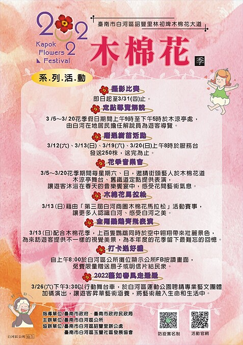 隨著花季到來,臺南市白河區公所更舉辦一系列系列活動,如攝影比賽、定點導覽解說、發送樹苗活動、花季音樂會、木棉花馬拉松、金剛鸚鵡齊飛表演等,有興趣的人快把日期寫下來。