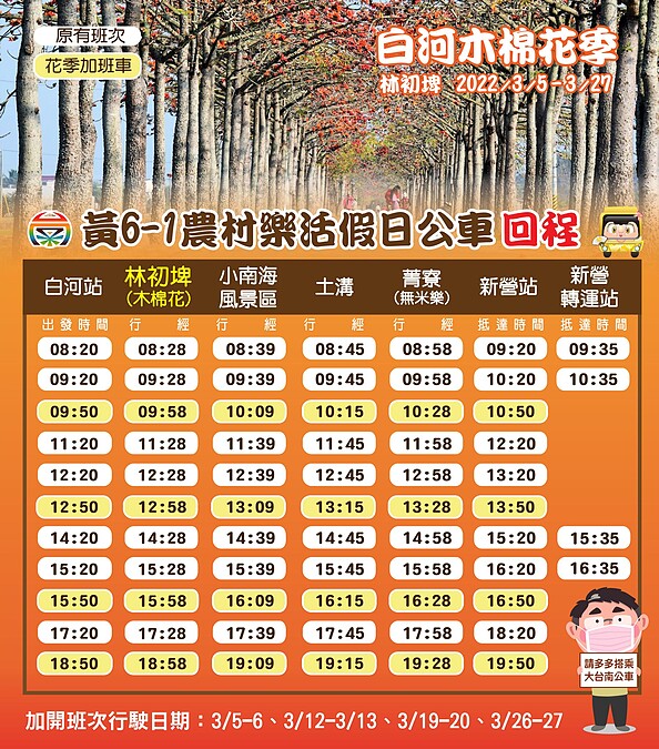高鐵嘉義站2號出口2號月台→黃9→後壁火車站→黃6-1→ 林初埤站