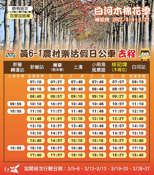 臺南市白河區公所公告目前花況已開6成,提醒要朝聖的人可得把握時間。另外也當心欣賞美景時,可能會遇到直直落下的「木棉花砲彈」。也因為木棉花道寬度有限,大概只能容納兩台車會車,建議遊客別把車開到裡頭。