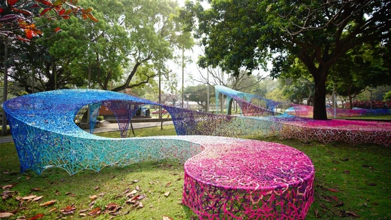 以南崁溪為靈感發想的《河流的形狀》,長32公尺的織品裝置,要重現河川就像是城市的動脈之意涵,並讓觀者省思人類與自然之間的發展,歡迎坐下或躺下好好感受其背後意義。