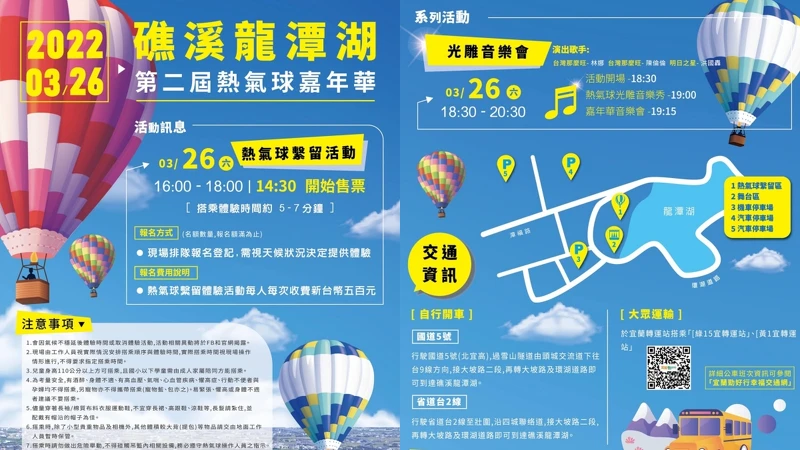 特別注意若活動會場車輛停放達到70%,便會實施「只出不進」的交通管制,屆時可於泉路、育龍路、龍潭湖宜5-2停車、步行進會場。而若氣候不穩,也會考慮延後或取消繫留體驗。