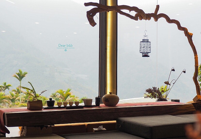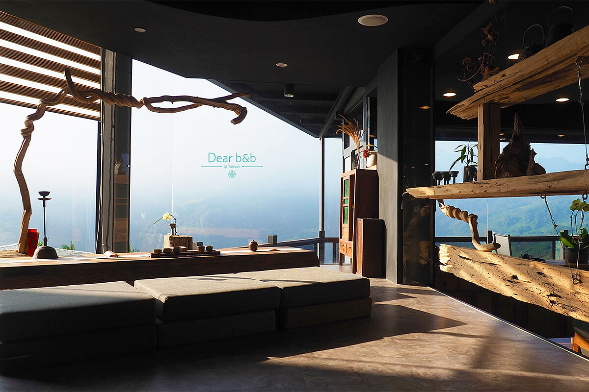 向前遠望,一大片落地窗倚畔著廣闊山景,是阿漢特地為了品茗的旅人設計的茶空間,擺放阿漢收藏及親手製作的檜木作品,沏一壺茶,伴隨著檜木香氣, 享受一整個下午的悠閒時光。