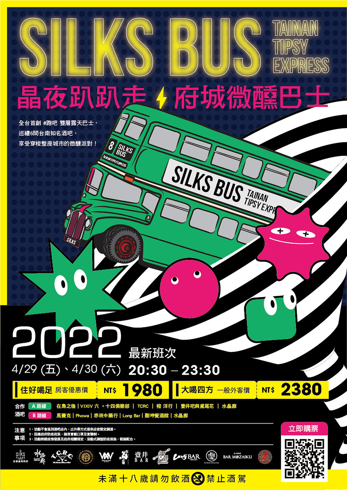 「微醺巴士」預計將於每個月擇一週末舉行,兩天將行駛A、B兩條不同路線,首班車將於4/29~30晚間8點半啟程,每班約可容納30人,單趟乘坐可開喝6杯調酒。售價每人2380元、台南晶英酒店房客優惠價1980元,有興趣的人,快上《晶好購》「活動課程」報名。