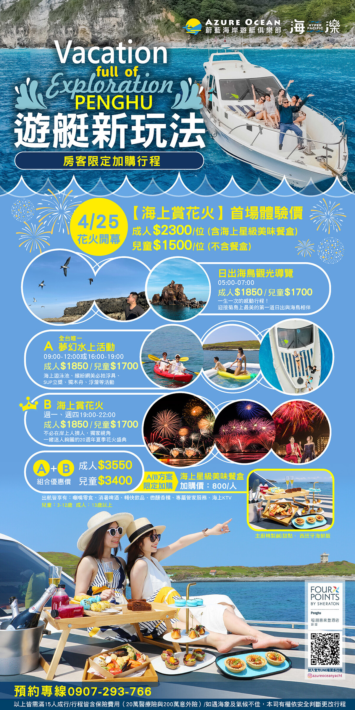 隨著年度觀光盛事到來,澎湖唯一五星級酒店「澎湖福朋喜來登酒店」同步推出多項房客加購專案,為遊客留下深刻燦爛回憶。首推「花火節遊艇派對」,能從遊艇上以海上視角享受花火綻放,搭配海面上倒影,並能大嗑輕食與各式飲品,短短3小時便能回味無窮。