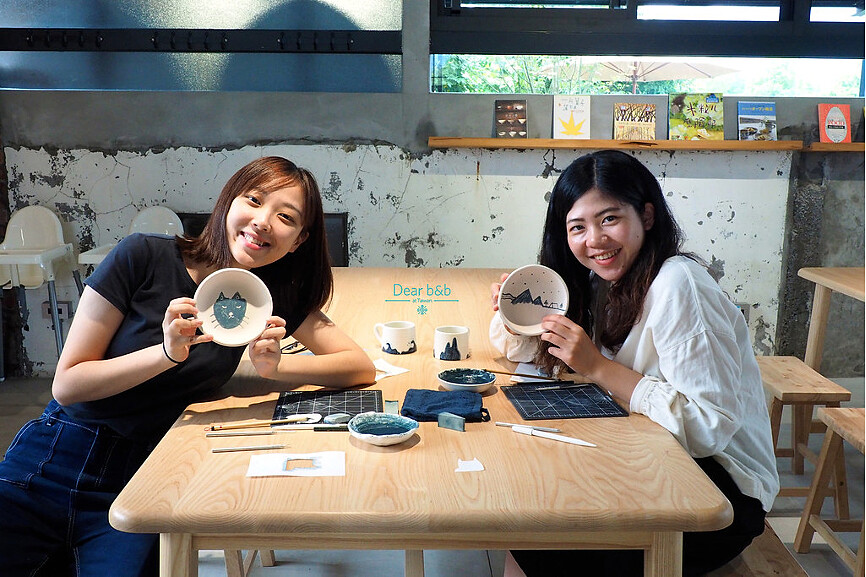 走入咖啡廳後方寬廣的青花瓷基地,挑選喜愛的素胚器具,在身為陶藝家的民宿主人悉心解說後開始以鉛筆描繪草稿、以靛青青花顏料上色,無論外頭晴雨四季,都能於一張張大木桌上留下美好回憶,也在最後燒炙完成帶回獨一無二的紀念品!