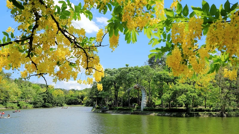 在每年5、6月金黃色阿勃勒開花季節,台南最具代表性的賞花勝地就屬新化的虎頭埤風景區!2023台南虎頭埤阿勃勒花季從5/20至6/4起跑,每周末都有豐富活動、在地小農攤販及街頭藝人演出規劃,賞花同時伴隨著湖畔音樂,氣氛相當悠閒,南部人快把握時間享受「黃金雨」之美!