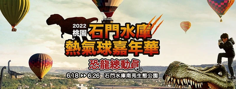 正好搭上《侏羅紀世界:統霸天下》電影熱潮,「2022石門水庫熱氣球嘉年華」以「恐龍總動員」為主題,推出雷龍、暴龍造型主題熱氣球,還有週末限定的「恐龍探索樂園」有兩人三腳與追趕及賽跑遊戲、Cosplay恐龍體驗等,勢必能滿足粉絲們的心。