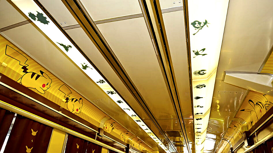車廂規劃「交流座席車廂」,椅背印上皮卡丘剪影、放一顆精靈球;地板則是閃電型尾巴圖案,天花板更藏有許多寶可夢圖案,到處都充滿驚喜!「遊戲車廂」更宛如夢幻天堂,中間有隻「巨大趴趴皮卡丘」等著大家,還可以一圓當列車長夢想,隨處也都有皮卡丘元素可以合照留影。