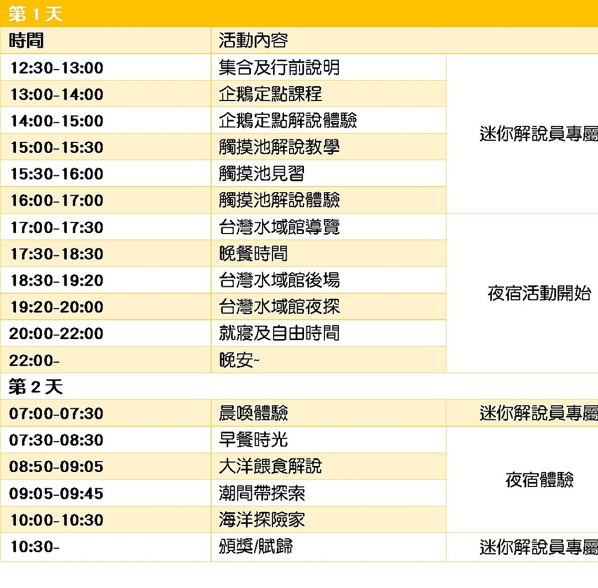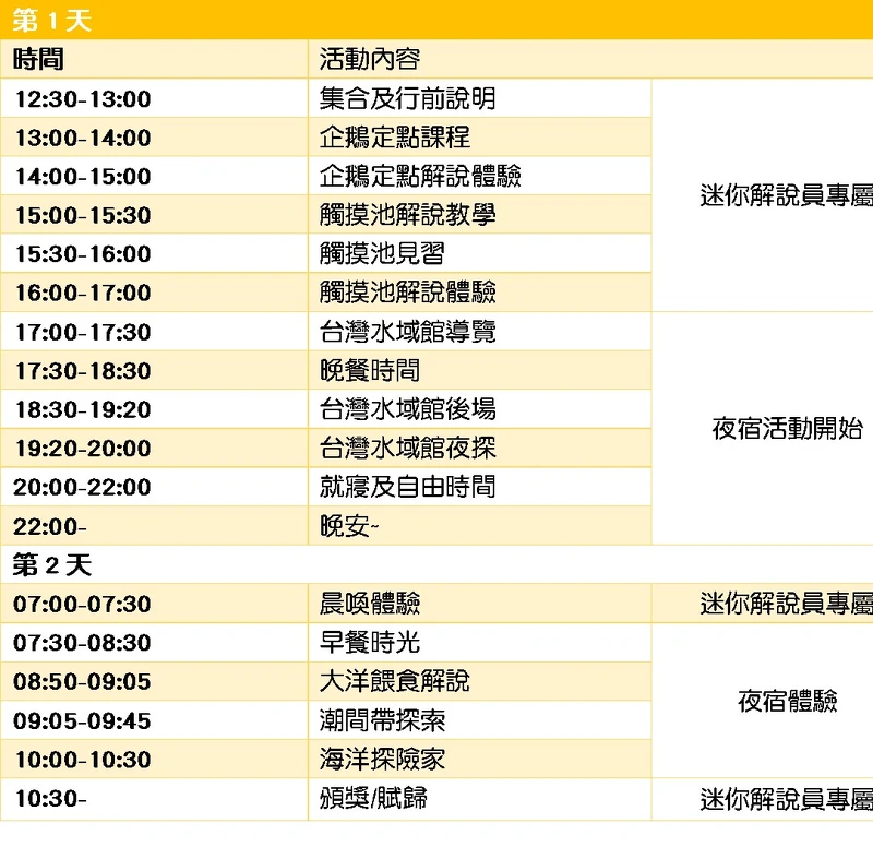 首度針對3~10歲兒童打造的「海洋親子營」活動,行程豐富又多元,包含走訪潮間帶,並從大洋一路探訪到南極冰原,可在途中餵食與觸摸可愛的海星等多種海洋生物、夜探水域館窺探夜間行動的海膽與龍蝦出來覓食,以及與人氣明星「企鵝」相見歡。