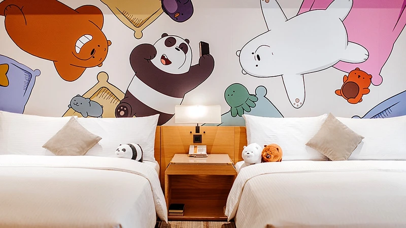 此專案可分為入住一般房型或卡通主題房,入住卡通主題房的旅客,除了能看到繽紛吸睛壁貼,退房時還能將12吋卡通布偶(每房2隻)、牙刷造型盥洗包、帆布袋、主題刺繡布章、購物袋通通帶走,回家後也能繼續回味旅行美好。