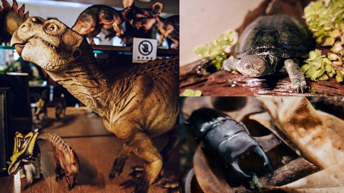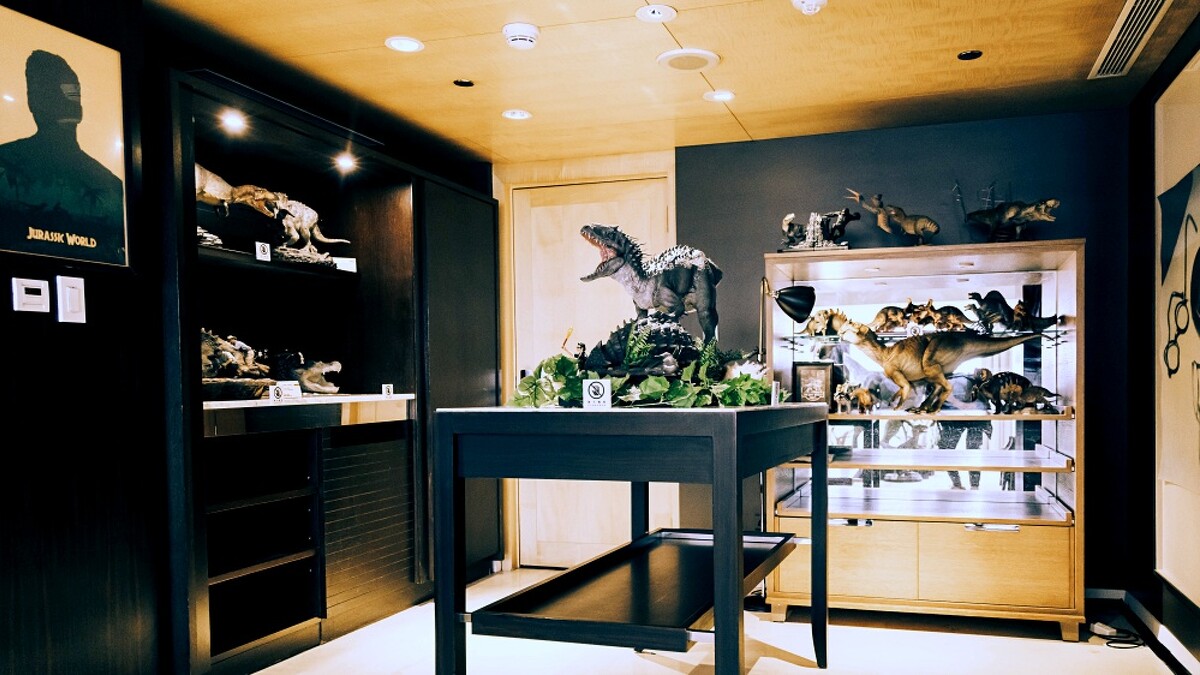 步入套房後,一尊高1米7巨型恐龍模型便等著你合照,周遭陳列百萬珍藏恐龍化石,以及包含雨林蠍、帝王扁鍬形蟲、宏都拉斯捲毛蜘蛛、巨人馬陸、高冠變色龍、刺蝟等,令人睜大眼睛一探究竟。特別的還在後頭,浴室更打造南美蜥、烏龜生態環境,將精緻套房設施變身熱愛叢林秘境。