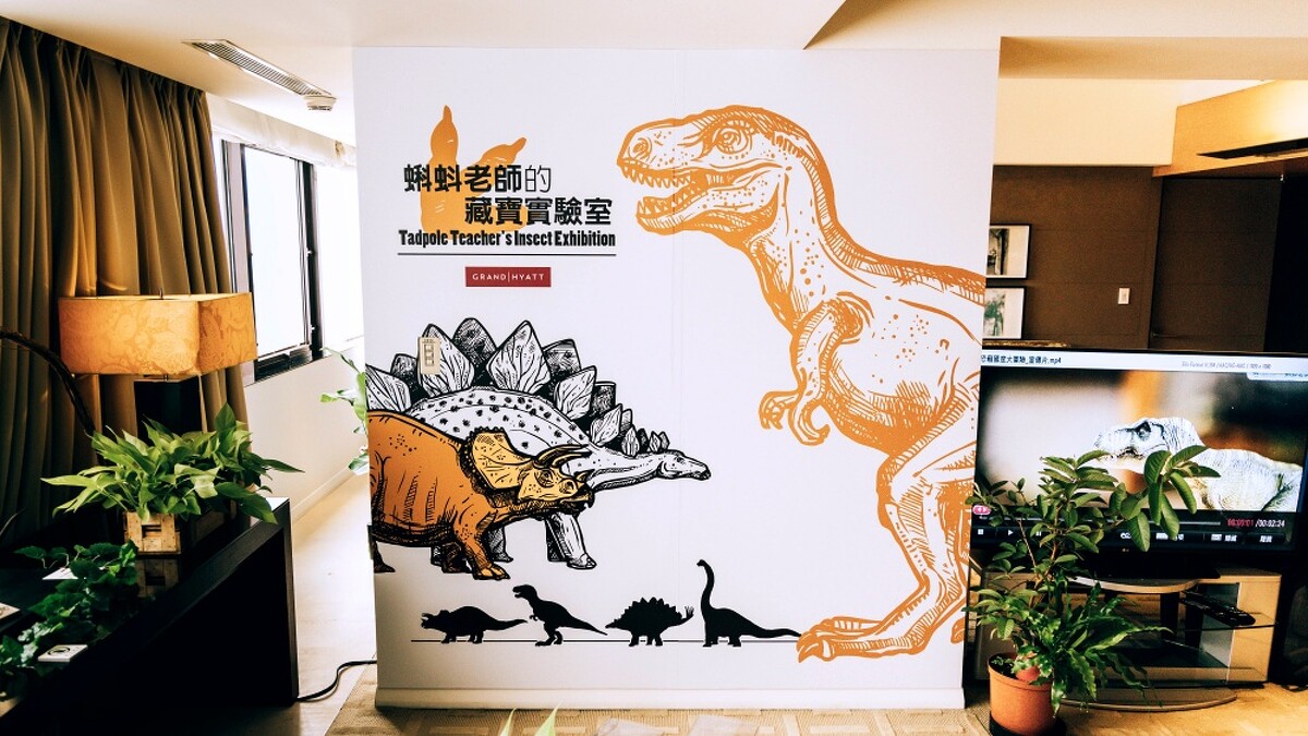 自7/8~8/31每週五、六、日,台北君悅酒店攜手「昆蟲界首席網紅名師」蝌蚪老師(呂軍逸)推出「蝌蚪老師的藏寶箱」住房專案,將25樓、占地57坪大的外交官套房改造成縮小版的「侏羅紀世界」,帶領大小朋友房客度假之餘也能增長知識。