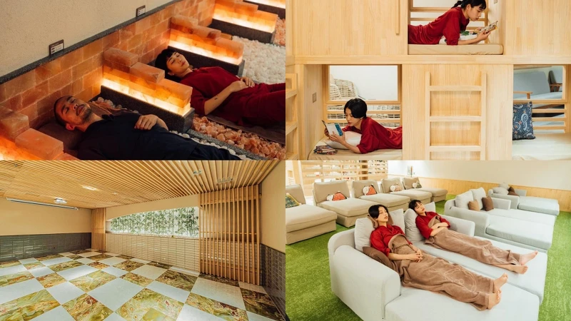 想一解日積月累的壓力?快到全台唯一「日式岩盤浴」紓壓一波!用五種不同溫度及風格造景的岩盤浴:赤塩、墨夜、鳳綠、潤竹、映雪,體驗如置身星空、竹林、白雪等不同環境,更能藉由遠紅外線與負離子盡情流汗、加速新陳代謝,是日本特有的美容養生方式。