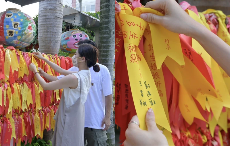 拜月老求姻緣,可準備一條紅絲線、鉛粉、甜糖六個祭拜,在月老面前擲筊杯,口中念「恭請月老幫忙」,報告自己的姓名、年齡、住址、喜歡對象的類型、條件,並說明事成如何還願答謝,接著擲筊杯,當取得連三個聖茭後,拿著紅線在香爐前繞三圈,並隨身攜帶;也可以像逸歡這樣向月老求得紅色或黃色的姻緣布條,掛在廟前的樹上喔。