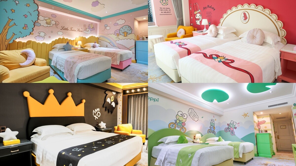 從旅館大廳就能看到Hello Kitty、美樂蒂、酷洛米、雙星仙子、大眼蛙、酷企鵝、蛋黃哥、淘氣猴列隊歡迎,一進到房間更會少女心融化!大片的牆面、床頭板、沙發、床頭櫃、天花板、浴室裝飾、淋浴間玻璃,毛巾都不放過,絕對會拍到手軟呀!