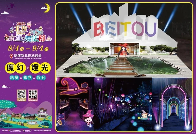 北投以前是凱達格蘭族的居住地,在平埔族語中北投(Kipatauw)的意思為女巫,因此「2022北投女巫魔法節」結合在地文化,7大公園化身為魔幻打卡景點, 如「幻境光廊」有色彩絢麗的圓拱走道、「忘憂魔法湯」的可愛南瓜擺設、「霓光閃爍」懸掛繽紛光球打造浪漫滿天星等等裝置藝術,讓北投化身越夜越奇幻的魔法世界!