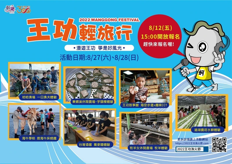 同時「夏日海洋燈祭」將為夜晚渲染浪漫氛圍,在王功漁港、福海宮及王功街道,現身數萬盞美輪美奐、燦爛奪目的LED燈佈置,還會有壯觀巨型風箏「港邊箏好玩」、兩座30米的戲水氣墊設施「蚵蚵笑遊樂趣」能拍好拍滿。想要一日遊的人,還有農漁牧輕旅行、烤蚵體驗、採蚵體驗、免費蚵藝DIY、祈福嘉年華多項活動,讓大家在歡慶之餘,享受王功之美、體驗在地海洋風情!