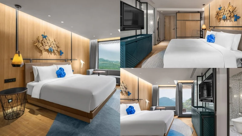 全台旅客敲碗的「全台最高酒店」阿里山英迪格酒店,客房多處都能體現用心及在地文化。以紅、藍作為兩色色調貫穿整體設計,從床上枕頭、獵人風迷你吧櫃子、地毯、床頭飾板都能感受主題色調氛圍。另外將象徵楓葉的幾何圖形,化作床頭飾板上,在房內便能感受濃厚秋意。而浴室磁磚設計取自於鄒族編織及螢火蟲微光元素,床頭也有一盞純白「藍鵲燈」,部分房型還有「黑色石頭蛋形蛋體浴缸」能愜意泡澡,從諸多小細節便能體會當地文化及美好自然意象。