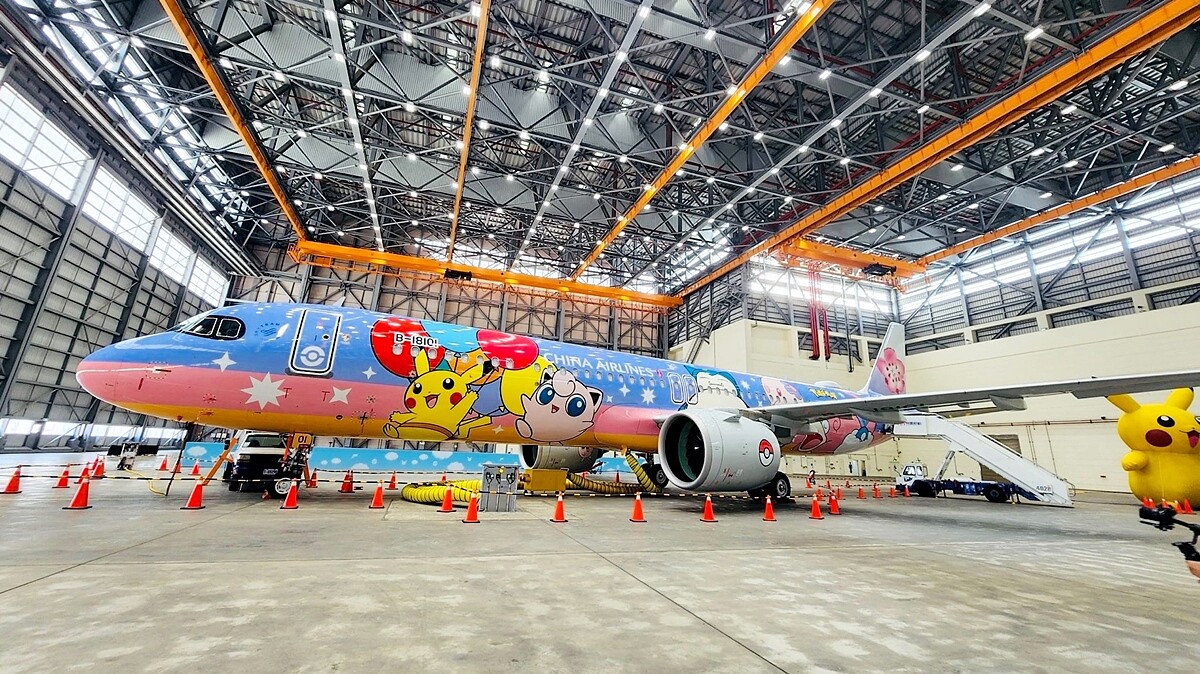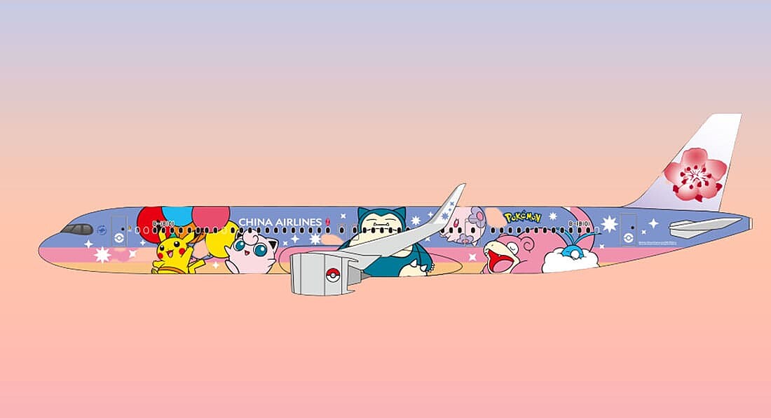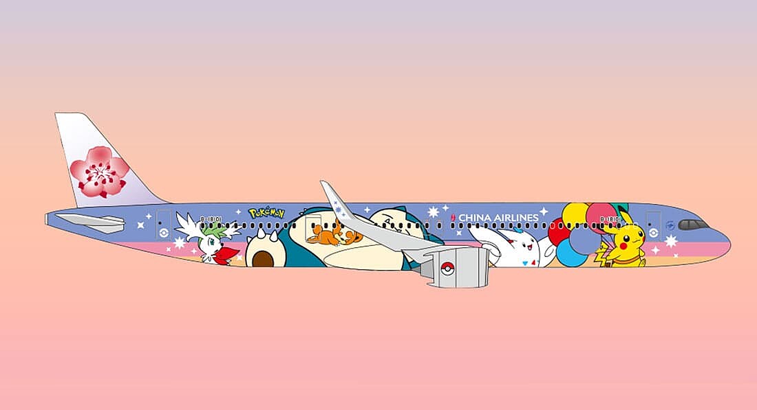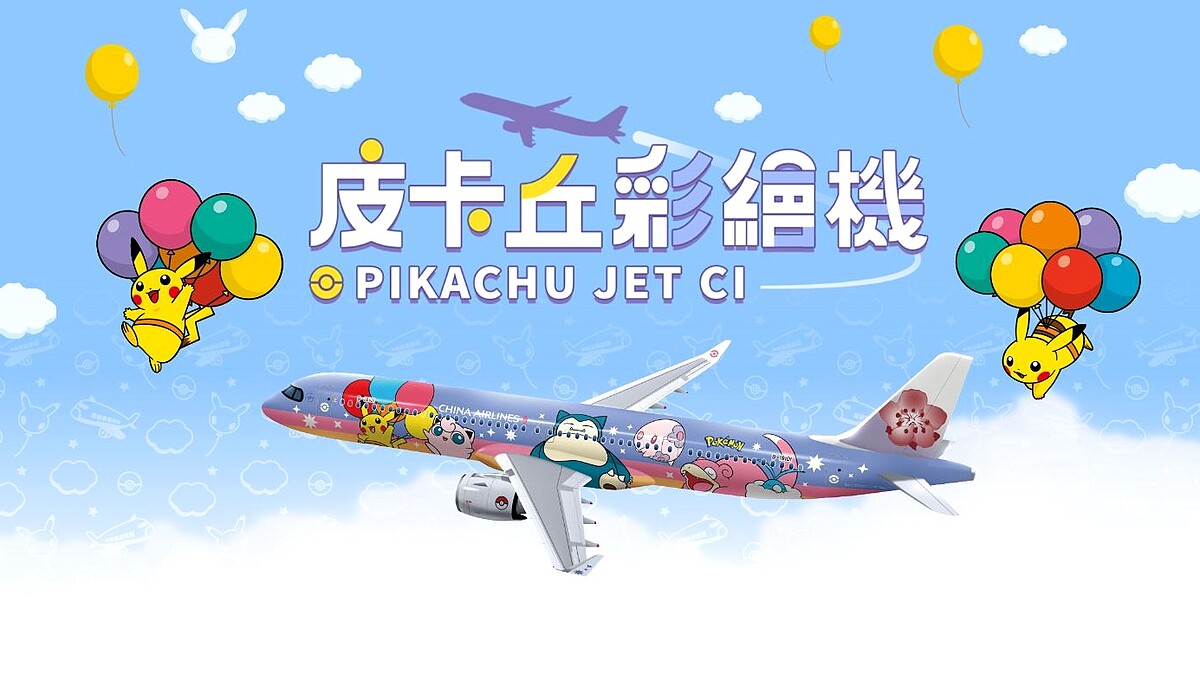 「皮卡丘彩繪機 CI」是寶可夢公司The Pokemon Company專為華航設計,使用多達36種色彩,在機身上繪製飛翔皮卡丘、謝米、青綿鳥、波克基斯、食夢夢、胖丁、卡比獸、呆呆獸、熊寶寶等11隻高人氣寶可夢,在粉紅至粉紫色的「黎明星空」漸層背景下,陪伴各位旅客一同翱翔天際。尾翼則有品牌識別圖案「紅梅揚姿」,歷經21天完成全機彩繪,成為華航有史以來最繽紛彩繪機。