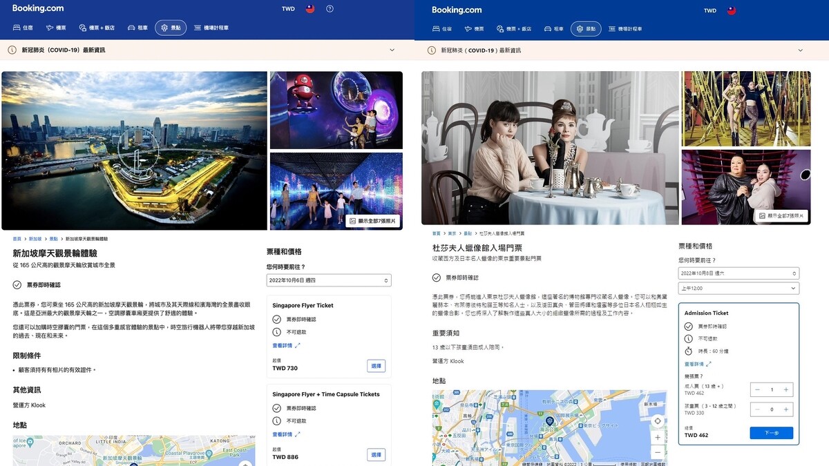 目前大多數為亞洲地區,包含韓國首爾3小時韓定食烹飪課程、新加坡摩天觀景體驗、日本東京杜莎夫人蠟像館、泰國曼谷丹嫩莎朵水上市場&大皇宮門票,以及台灣景點遊程,是否等不及開始安排出遊行程了呢?