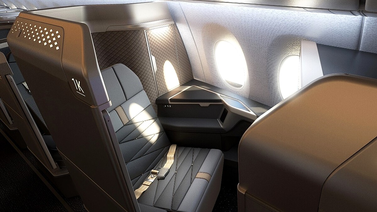 A350-900一共規劃306席座位,其中頭等艙會有4席,為1-2-1的座椅配置。各自擁有60吋拉門、獨立走道出入口、獨享能容納登機箱及大衣與厚外套的個人置物空間。配備32吋4K高解析螢幕,也能支援藍牙無線音源傳輸,在雲端上能享有絕佳影音感官饗宴。