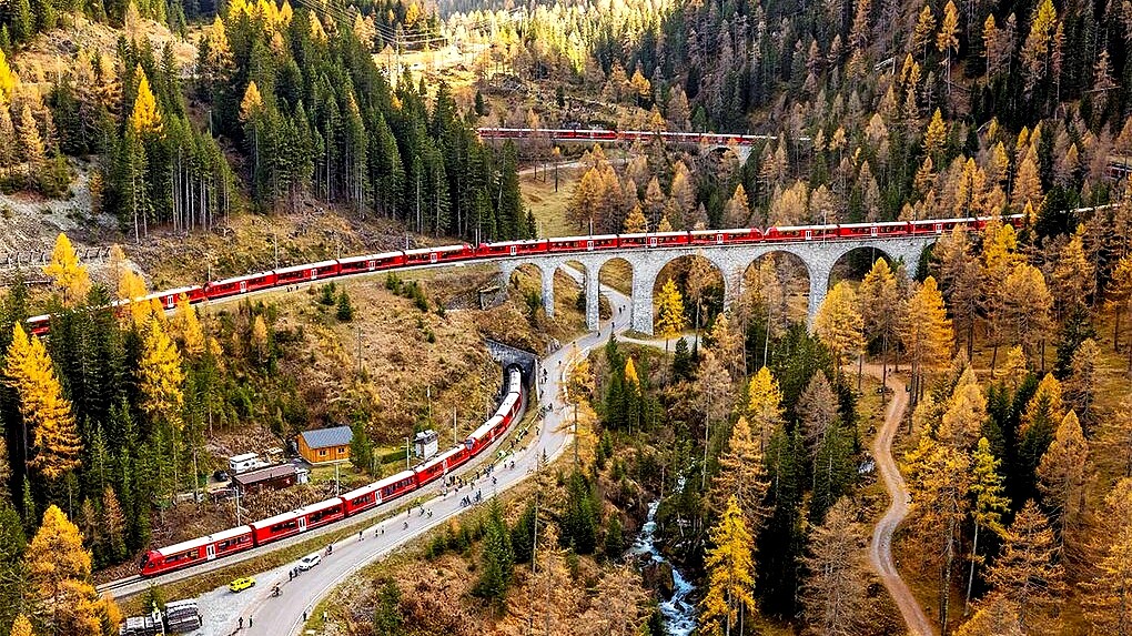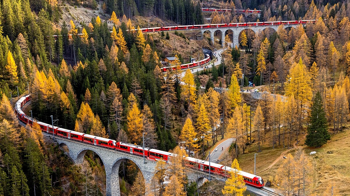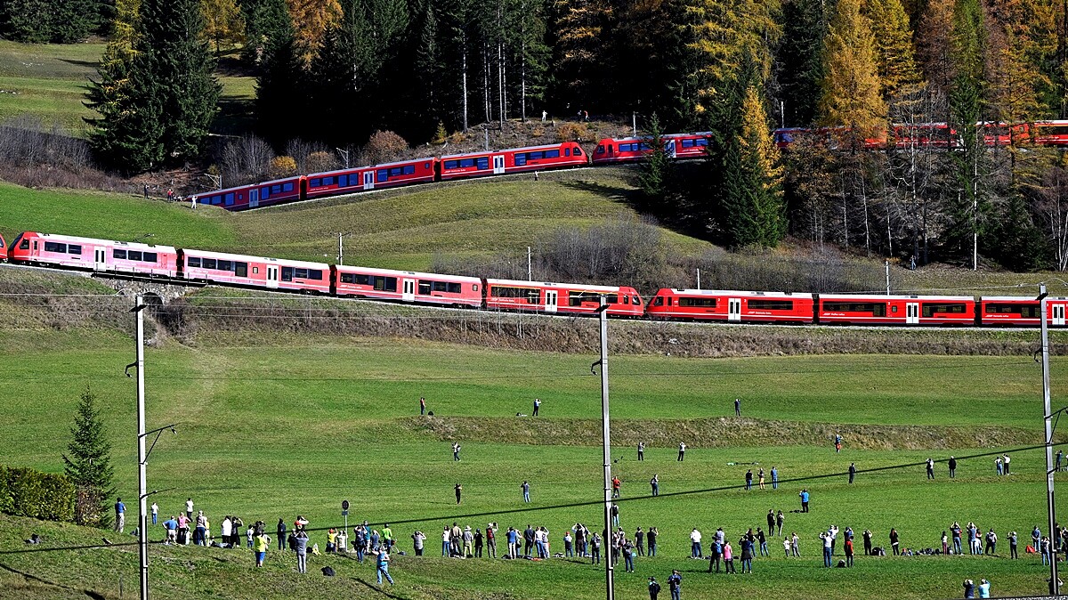 以世界上最多登山鐵路文明的瑞士,其民營公司「雷蒂安鐵路」(Rhaetian Railway,RhB)為了慶祝瑞士鐵路175周年,於10月挑戰成功開通「最長載客火車」!將25列(100節車廂)連接成長達1906公尺長列車,行經海拔1788公尺高的普雷達Preda至海拔999.3公尺的阿爾瓦努Alvaneu,路途包含48座峽谷、高海拔地區的彎道、隧道、高架橋及窄軌鐵路。