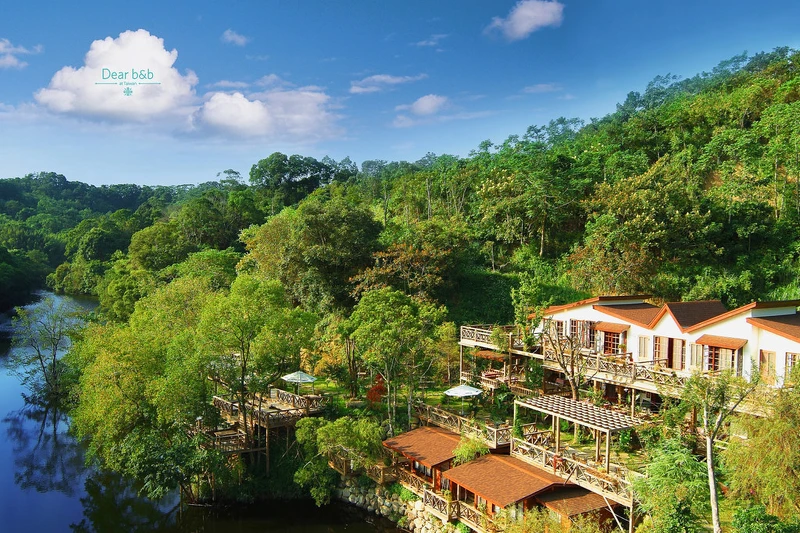 下了車,兩旁的花草樹木及石子路指引方向,主屋沿著湖畔而立,山環水繞、四周花木扶疏。旅人可以在初春賞紫藤和賞櫻、在春末看油桐、在深秋望楓紅,夏夜還可能撞見翩翩起舞的螢火蟲,一年四季的景致各有不同,為旅人帶來獨特的美好邂逅。