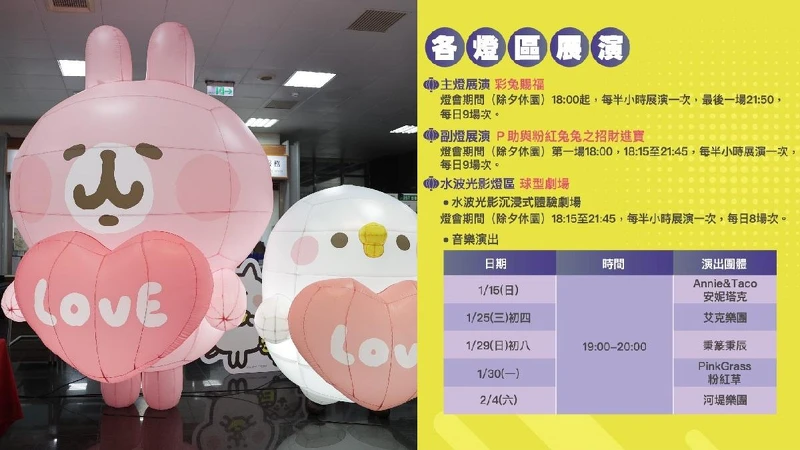 2023南投燈會最眾所矚目的就是與「卡娜赫拉的小動物」聯名合作,一進場就能看到卡娜赫拉的小動物大型拱門「穿越吧!新春之旅」迎接眾人,由P助和粉紅兔兔展開雙臂擁抱所有遊客。7米高的巨型主題副燈「彩兔賜福」和「P助與粉紅兔兔之招財進寶」萌翻南投夜晚!另外還有「發財吧!財神快拜」、「郊遊吧!新年走春」、「按讚吧!祈福求願」以及「告白吧!戀愛來了」四大專屬燈區,共佈置了12座充氣偶燈,讓你走到哪都看得到可愛兔兔身影。