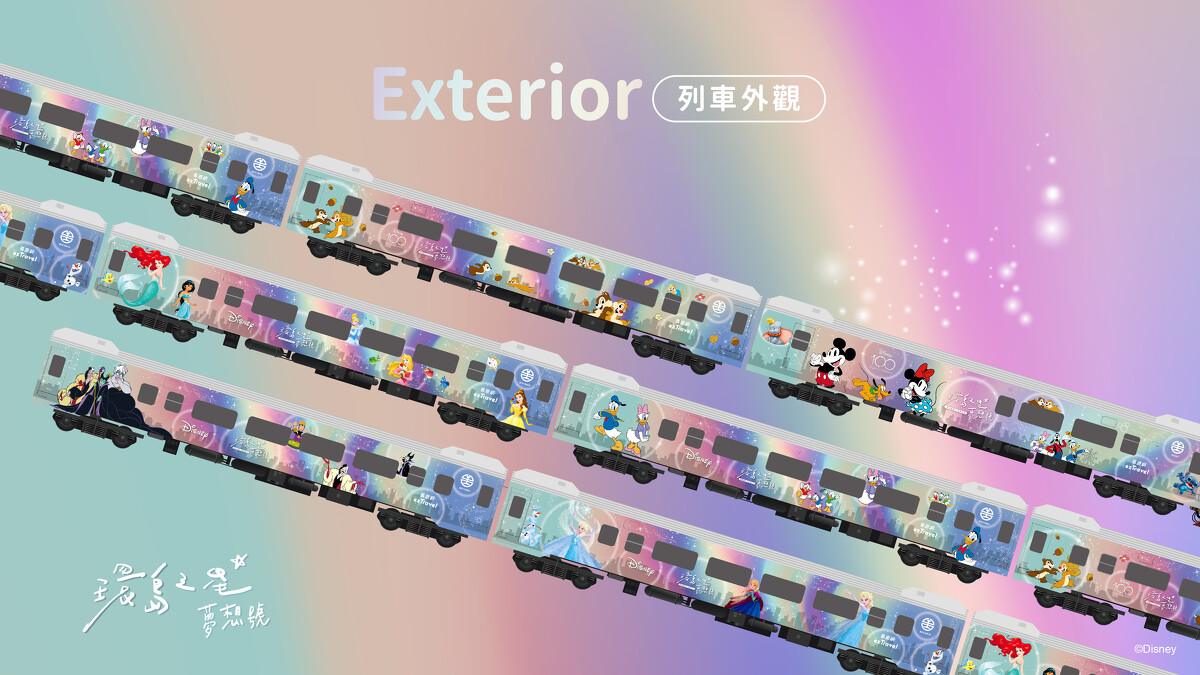 此次列車外觀配合迪士尼百年主題,首度以太空銀金屬色調為基底,並配上幻彩炫光色彩,營造出滿溢未來感的光澤視覺效果。每節車廂更有彩色繪製的迪士尼角色、手寫列車品牌,呈現出有別以往的大人感及文青氣息。