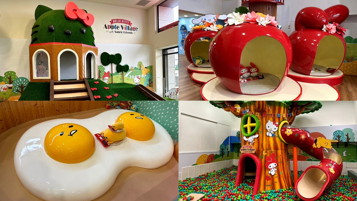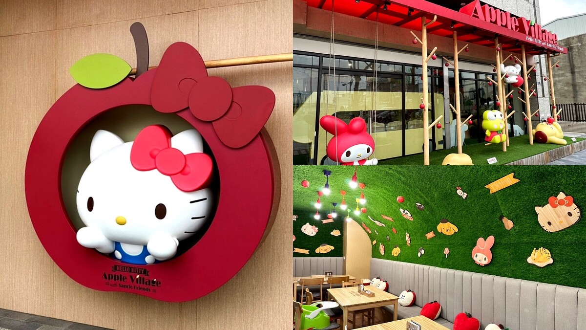 2020年開幕的「Hello Kitty蘋果村親子餐廳」有豐富及完善的空間規劃,有用綠地打造的草原用餐區、凱蒂貓蝴蝶之丘、布丁狗野地露營車、三麗鷗夢想蘋果樹、蛋黃哥太陽蛋浴池、大耳狗軟綿綿隧道、美樂蒂蘋果花園、三麗鷗夢想蘋果樹等多處遊樂區,吃飽喝足後就能大肆玩到瘋掉。