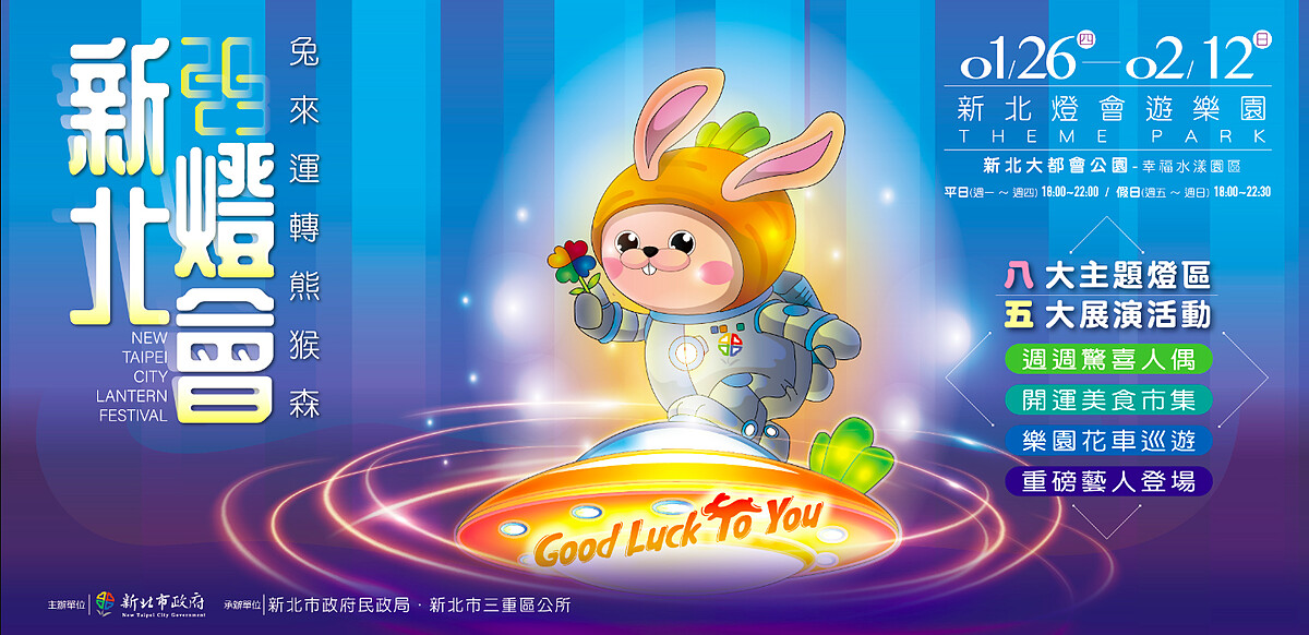 「2023新北燈會」將於1/26~2/12在新北大都會公園、全台最大的堤坡滑梯樂園的「熊猴森樂園」舉辦,園區有數十座溜滑梯跟豐富的遊樂設施,是近年來新北市超人氣親子景點,適逢生肖兔年,燈會主題訂為「兔來運轉熊猴森」,共規劃8大主題燈區,大可以從白天玩到晚上!