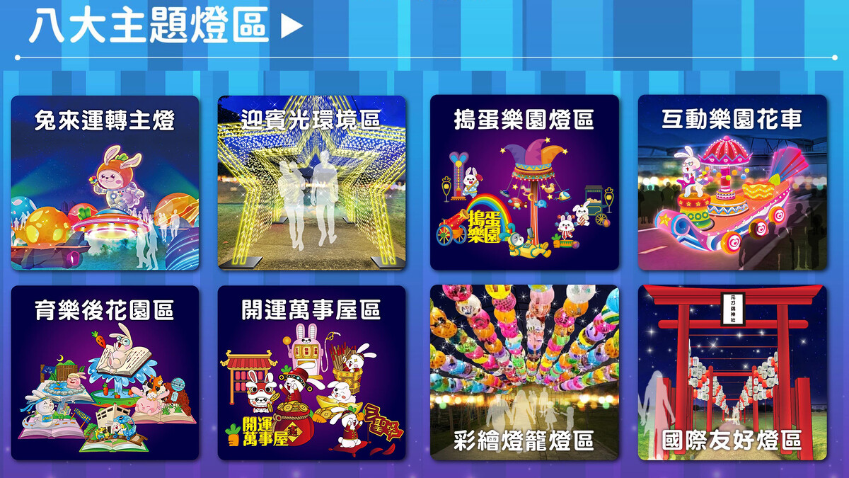 主燈是8米高的「兔來運轉」,整體造型是可愛太空兔乘著飛碟,在整點時會隨著音樂跟燈光旋轉360度,一旁還有雷射光束、煙霧變化,營造出奇幻氛圍,每天展演5場。其他燈區還有能穿梭其中的「迎賓光環境」、四本大型立體書打造的「育樂後花園」、兔兔帶大家求好籤的「開運萬事屋」、可以玩踩踏地燈的「搗蛋樂園」、媲美樂園的「互動花園花車」,以及1000顆市民手繪燈籠排列成的「彩繪燈籠燈區」,圓圓的燈籠串形成廊道完全是網美打卡景點!