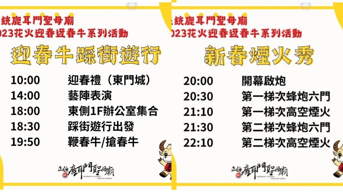 另外當天下午,因疫情取消2年的「搶春牛」踩街遊行也恢復辦理,會有藝文團體、文武陣頭輪番演出。晚上8點更有「炸蜂炮」活動,一連六門、每門超過千發,有趨吉辟邪、求財路興旺的意涵。這個周末就去台南熱鬧迎春!
