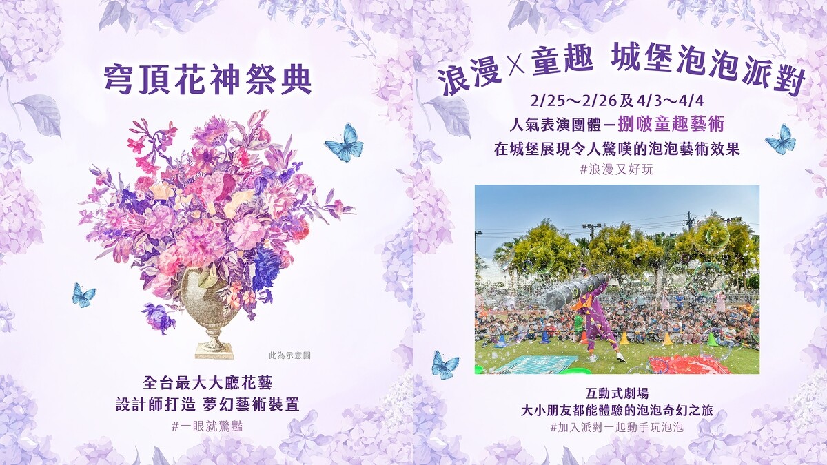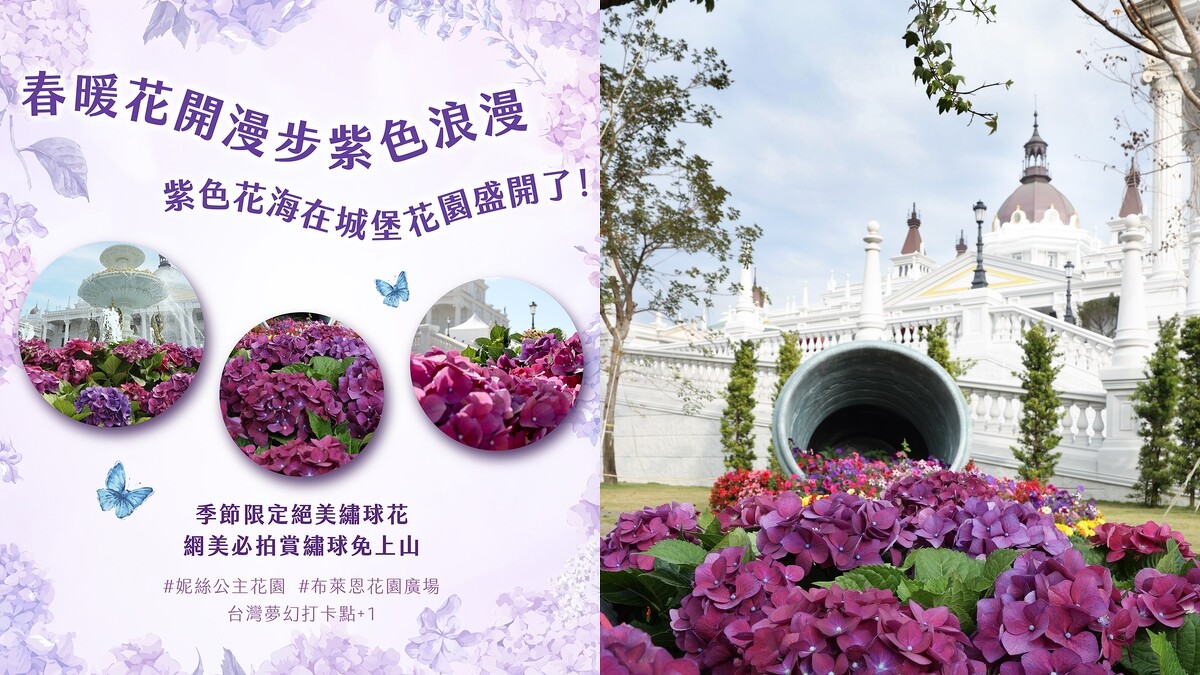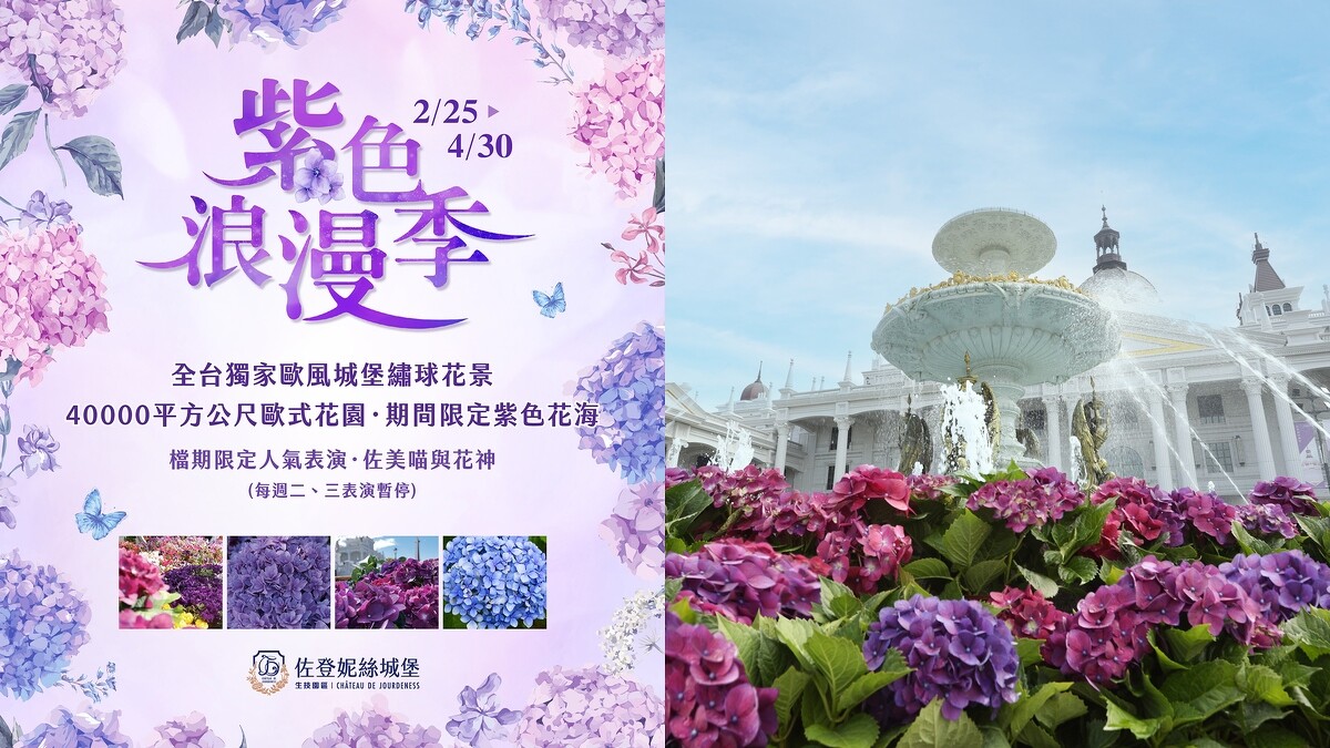 2/25起至4/30,「佐登妮絲城堡」進入「紫色浪漫季」,有全台最大、高達3.6公尺的室內花卉藝術創作「花神祭典」、由超過千株繡球花及薰衣草交織出的「紫色花毯」,為園區增添唯美浪漫氛圍,走到哪都能體驗春暖花開的美好。