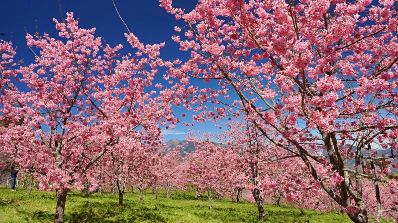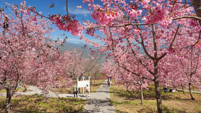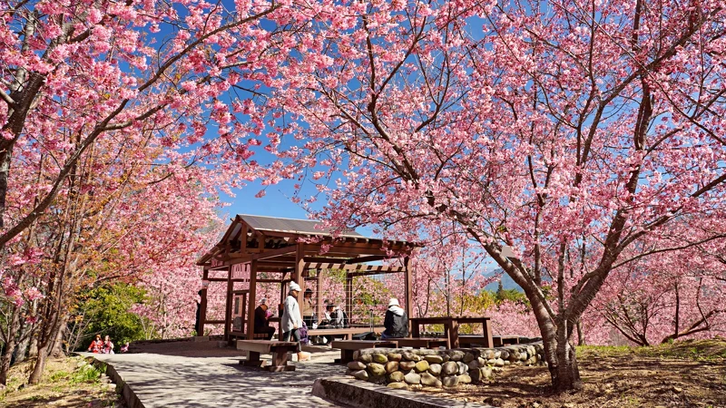 位於中央山脈與雪山山脈群峰之間的福壽山農場,在2019年正式開放「千櫻園」,一舉成為超人氣,同時也是全台海拔最高的賞櫻勝地!占地廣達8公頃、種植6000棵櫻花樹,品種包含緋寒櫻、昭和櫻、富士櫻、大島櫻、鬱金櫻,以及特殊品種葉櫻、菊櫻、御衣黃櫻,會依照時序接續綻放,漸層色調的粉嫩花海實在美不勝收!園區內還設置LOVE字樣休憩涼亭、規畫步道及觀景台,不論是一家大小或情侶約會需求都是絕佳目的地。