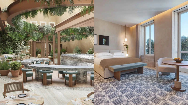 室內設計由建築師Patricia Urquiola操刀,將古典建築與結合現代風格,巧妙搭配綠植、自然光線和開放空間設計,把人與自然之間的情感連結。以深植於羅馬文化的「母狼Aurelia」作為酒店吉祥物,隨處都能一窺濃厚的當地元素,如古羅馬帝國常用的建材Cocciopesto灰泥、當地石材;部分客房露台中,更設有承襲自古羅馬時代的Triclinium風格大理石躺臥座椅。