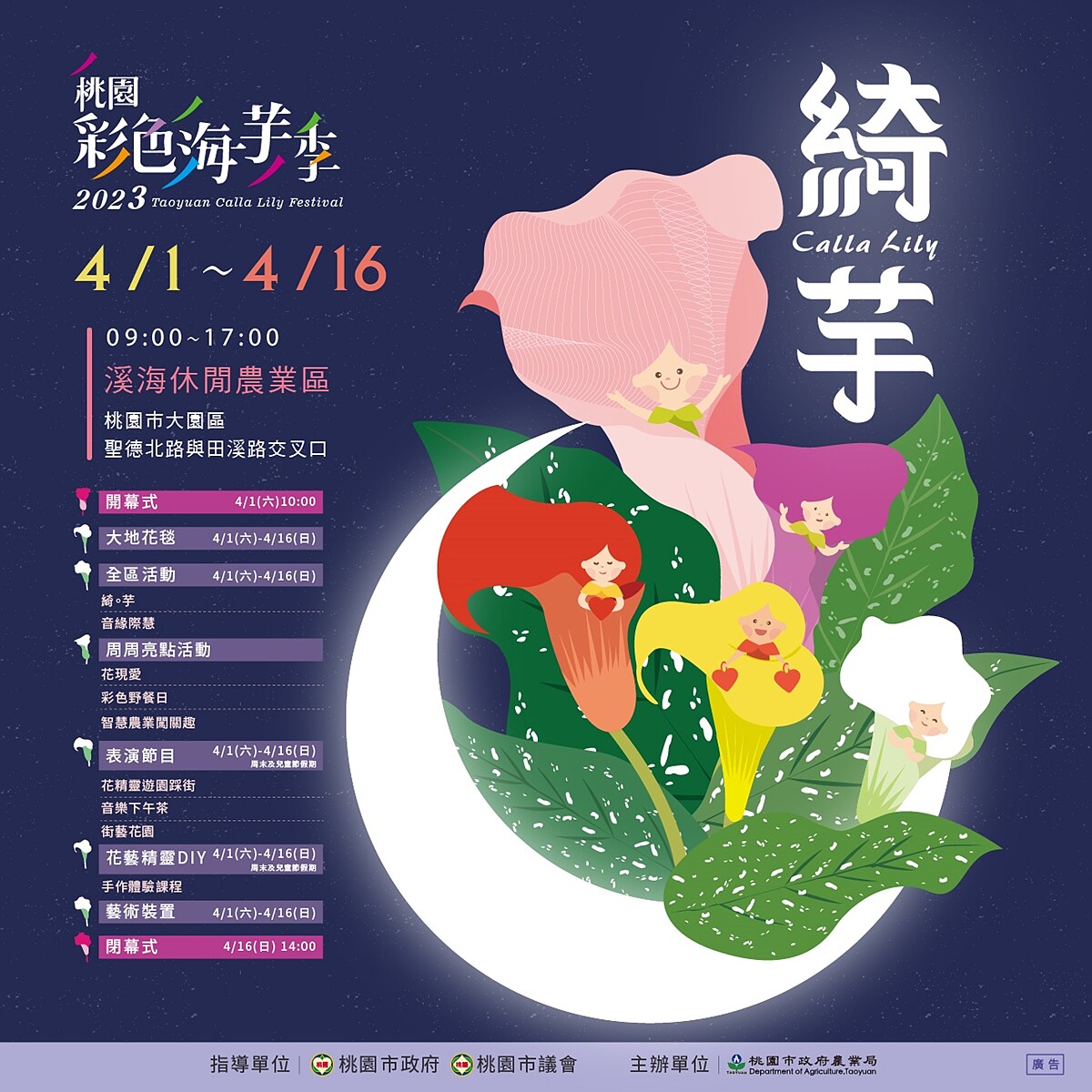 位於大園區溪海休閒農業區舉辦的「2023桃園彩色海芋季」,將以「綺麗的海芋」、「奇妙的相遇」及「奇幻的尋覓」為3大主軸,會有8萬株彩色海芋、2萬株百合及18萬株的在地草花,交織出一幅幅繽紛花田。最大的打卡裝置藝術為高5.5米、寬16米、長20米主花區「青鳥。芋守」,還會結合一座「許願噴泉」,為唯美風景更添迷人畫面。