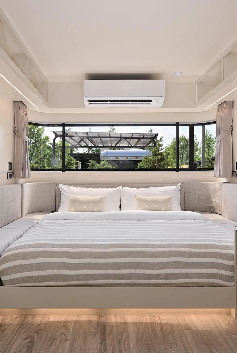露營車內配備部分,備有鬆軟舒適的 QueenSize 獨立筒機能床墊雙人床,內建寬敞潔淨的獨立衛浴,使用 ACQUA DI PARMA 沐浴組、Dyson 吹風機、Toto 免治馬桶、55吋液晶智慧電視、大金變頻冷暖氣、負離子除濕機、一轉三充電線、精選 Minibar及Netflix 免費觀看帳號,還有防水藍牙喇叭可以免費租借。入住露營車,也有兼顧住宿品質的飯店級享受。
