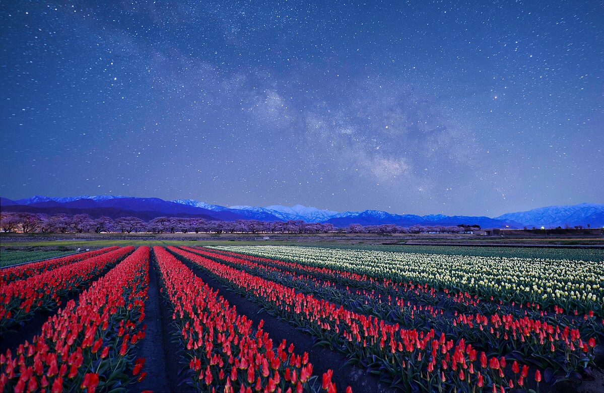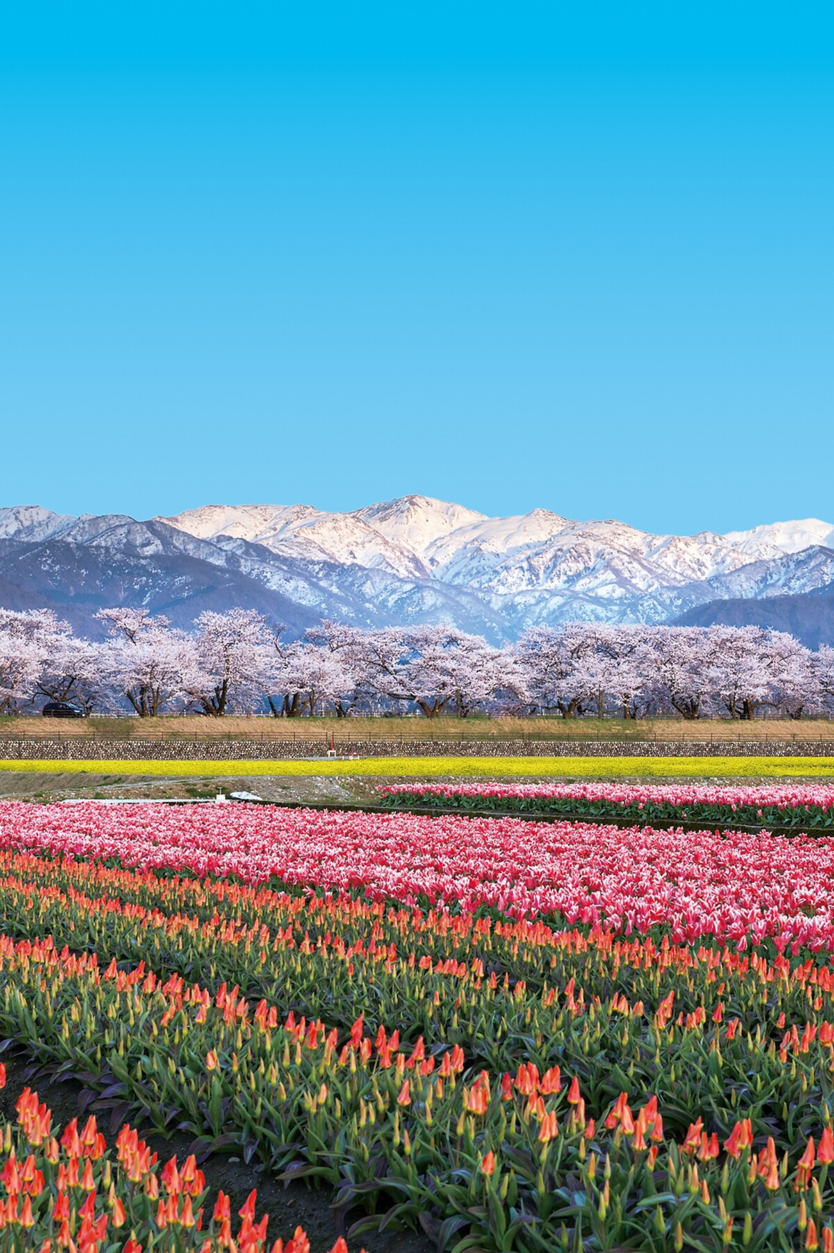 位於富山縣的朝日舟川,在每年春季都會上演一場由櫻花、油菜花、鬱金香和朝日岳的殘雪所組成的天然春季四重奏。這裡的櫻花樹是在1957年的河川改修之際,由當地居民共同種植而成。在全盛期約30家鬱金香農家於此,雖現僅存1家,農家為了配合賞櫻時期,便挑選了極早生的品種及能採收菜籽油的油菜花,搭配後山的雪景,形成了獨特的春季爛漫美景。