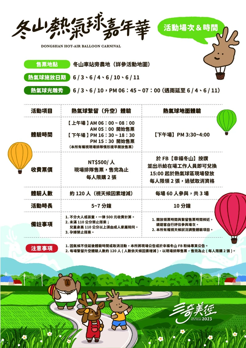每年超吸睛的重頭戲「2023冬山熱氣球嘉年華」,今年規劃於6/3、6/4、6/10、6/11登場。「熱氣球繫留體驗」票價為每人500元、只限現場購票,一人限購兩張。每天都有上午及下午兩場,場地則移到「冬山車站旁農地」舉行,有興趣的人千萬別跑錯位置。6/3、6/10兩天晚上18:45-19:00還有「熱氣球光雕秀」,若碰到下雨就會順延。