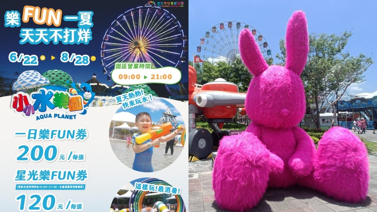 北部人都不陌生的「臺北市兒童新樂園」,在連假裡勢必擠滿人潮,因此園區特別延長營業到9點,並規劃4公尺高的巨大粉紅兔「七逃」、好逛又好吃的「吉刻市集」見客。另外還有每場50分鐘的「小小水樂園」、每次只要50元讓小朋友消暑一番!下午4點後還有120元的「星光樂FUN券」,可以不限次數暢玩1-13號設施。