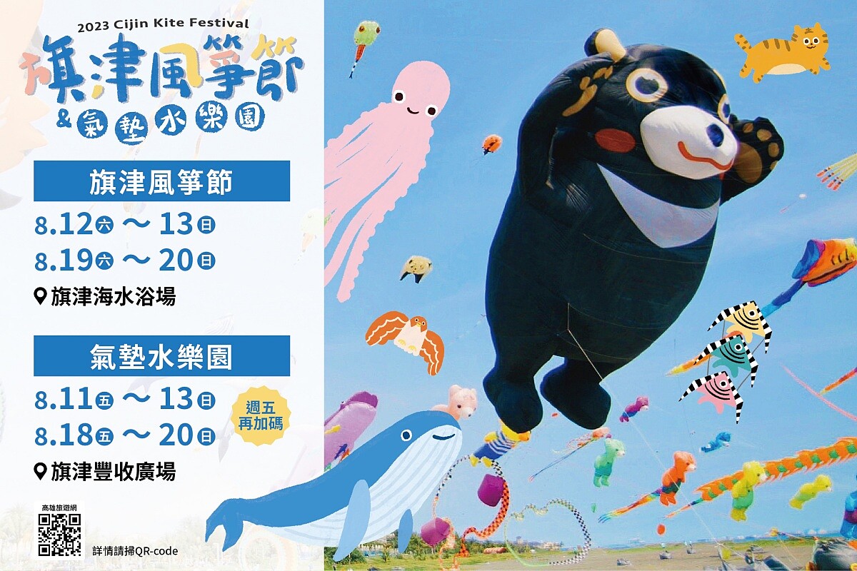 高市府觀光局透露,「2023高雄旗津風箏節」會是全台唯一陸海空都可以玩的風箏節,不只有各主題風箏展演,還有大型地景風箏可以拍照、7/22開幕當天有限定版衝浪風箏秀、首度放飛12公尺長的「高雄熊風箏」,在天空中打造超療癒畫面!