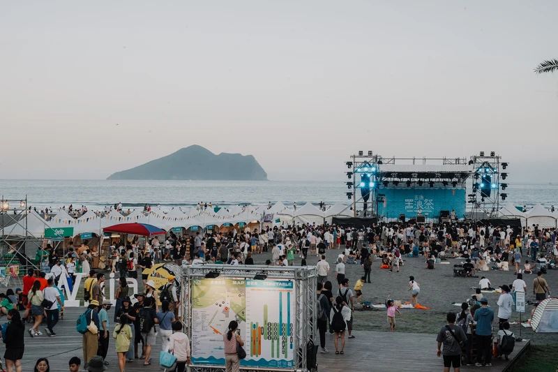 五漁罟浪祭的一大特點,是所有活動的背景都是海洋。當我們踏下外澳遊客服務中心的階梯,夕照將遠方的龜山島染成淡粉色,舞台兩側有展現頭城在地海味的週末限定「潮汐市集」,匯聚了在地美食名攤、以海為靈感的各色設計品牌,吸引走逛人群一邊隨音樂舞動,一邊與攤主們談天挖掘美食、尋找寶物,在海風吹撫下,感受日子的悠閒慢活。並且還有結合海洋文化,特意在漲退潮時段提供潮汐優惠或限定商品,以海洋作息的小巧思創造不一樣的市集體驗;平日則有展示在地物產與美食的「文創市集」,讓人看見在地品牌的迷人之處。