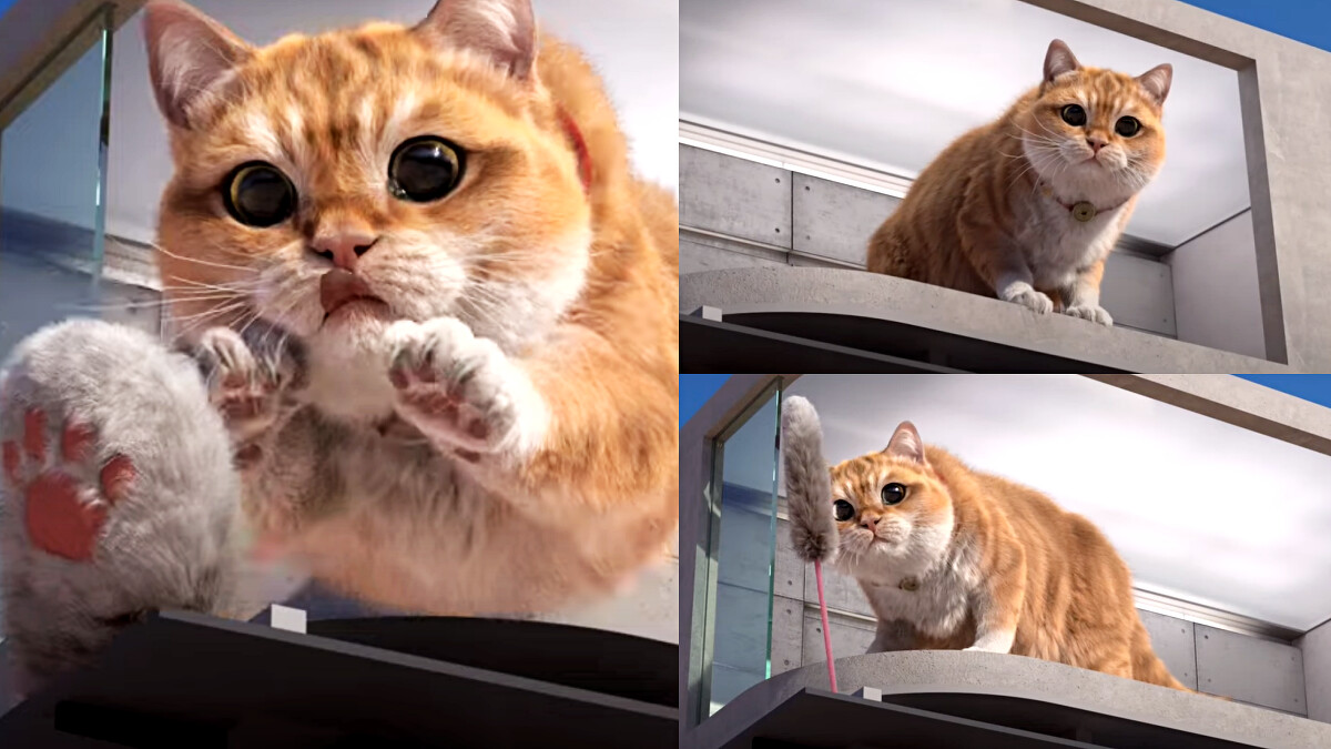 這隻胖橘貓平時就在螢幕中賣萌發呆,若人潮少時會呈現熟睡狀態,甚至會發出呼嚕聲!而待人潮眾多時,牠會被感應裝置叫起床、伸懶腰探出頭及觀望周遭環境,有時更會跳出窗外看海景,路過的人記得要拿起手起捕捉這幅超可愛畫面。