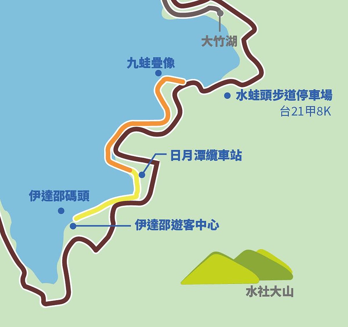 現在除了「日月潭環湖自行車道」能飽覽壯闊景色,斥資8000萬的「伊達邵水上自行車道」便能串接起潭邊多個旅遊景點,能一路輕鬆騎乘自行車,從伊達邵碼頭行經纜車站,更能延伸到九蛙疊像觀景平台,同時欣賞水域沿途美景,感受別於以往的單車體驗。